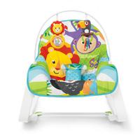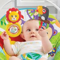 A Fisher-Price® Cadeirinha Macaquinho e Leão serve como uma relaxante cadeira de balanço ou um assento fixo para crianças, com dois bichinhos suspensos para bater.